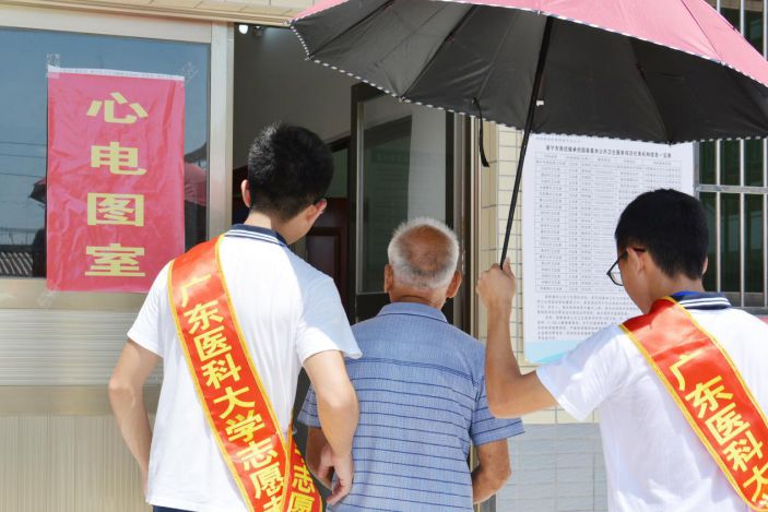 △廣東醫科大學三下鄉服務隊在義診現場爲村民提供引導、協診等志願服務。